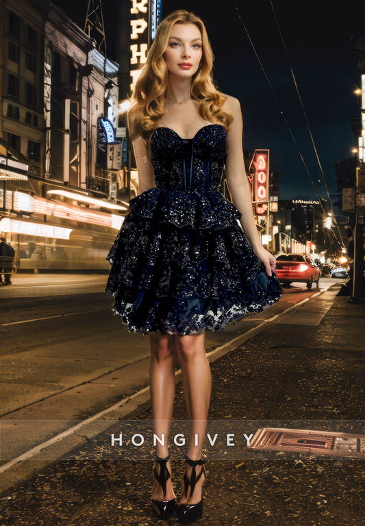 Lace A-Line Sweetheart Strapless Sequined Tiered Short Homecoming Dress