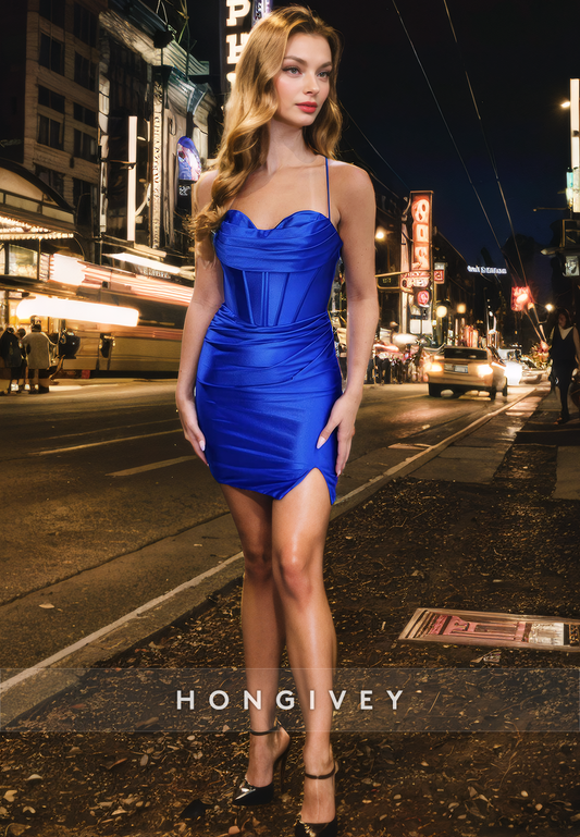 Satin Fitted V-Neck Spaghetti Straps Empire Ruched Short Homecoming Dress