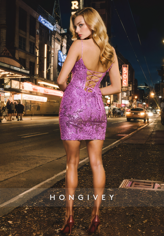 Glitter Fitted Spaghetti Straps Sequined Appliques Short Homecoming Dress
