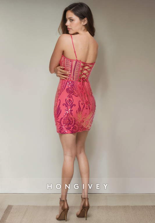 Glitter Fitted V-Neck Spaghetti Straps Fully Sequined Short Party Homecoming Dress