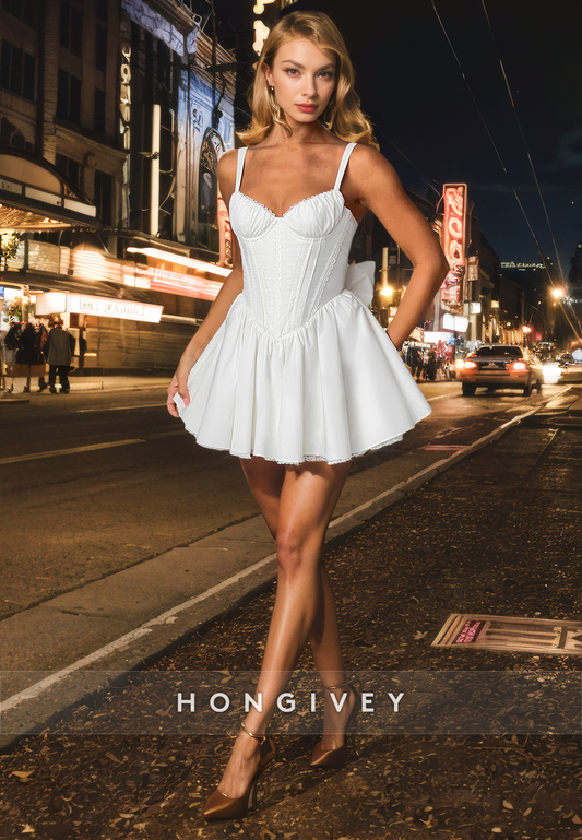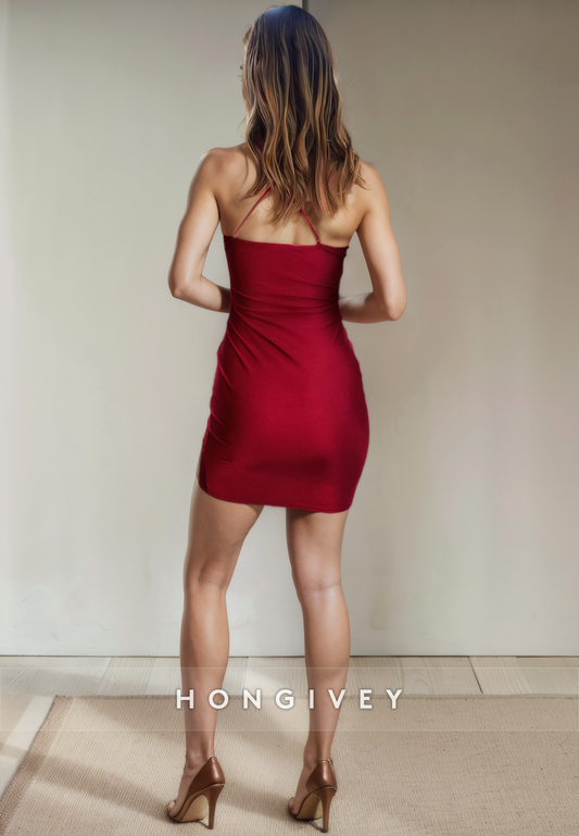 Casual Satin V-Neck Spaghetti Straps Pleats Short Party Homecoming Dress