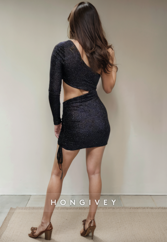 One Shoulder Long Sleeve Illusion Empire Glitter Short Party Homecoming Dress