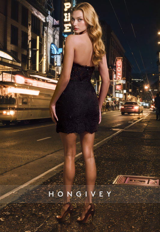 Black Fitted Sweetheart Strapless Lace Applique Beaded Short Homecoming Dress