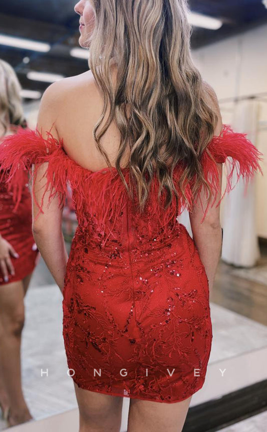 H2159 - Sheath Off-Shoulder Feathers Appliques Lace-Up Party/Homecoming Dress