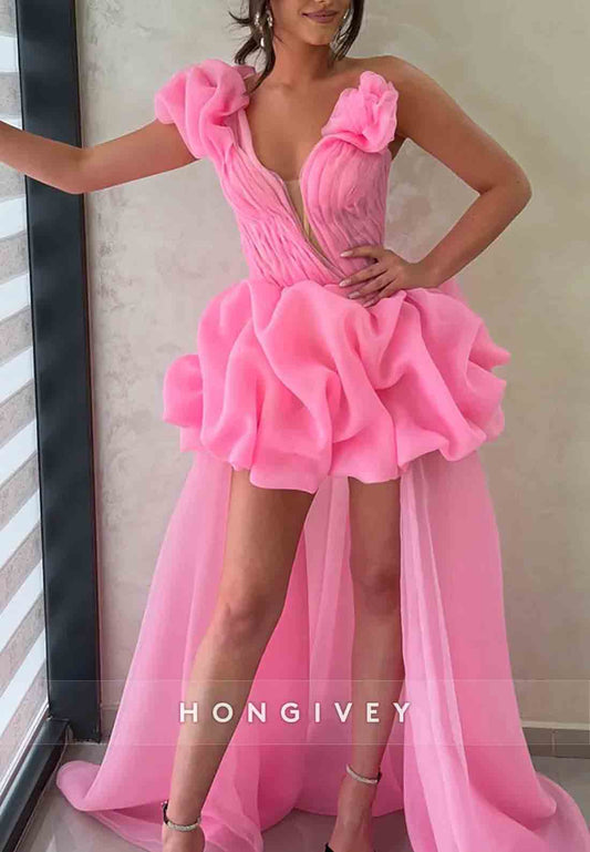 Gorgeous A Line One Shoulder Pink High Low Homecoming Dress with Train