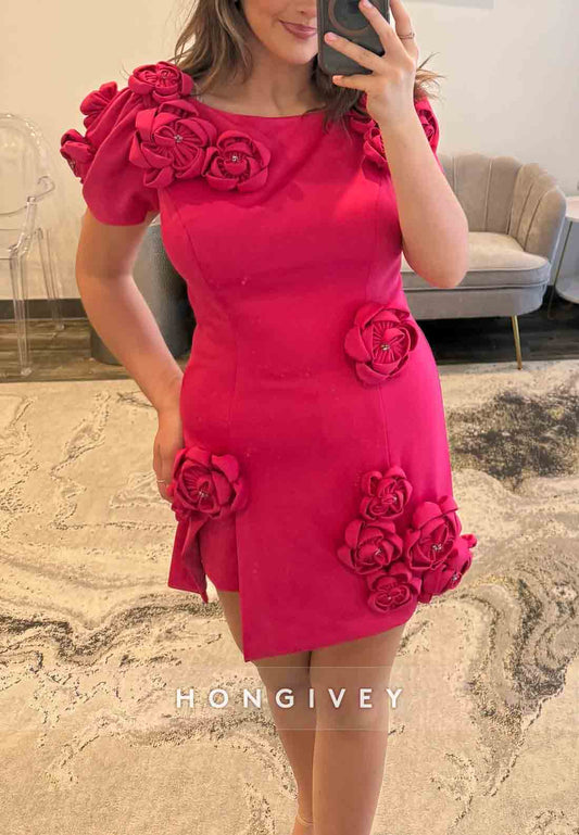 Fuchsia Short Sleeves Side Slit Short Homecoming Dresse swith Flowers