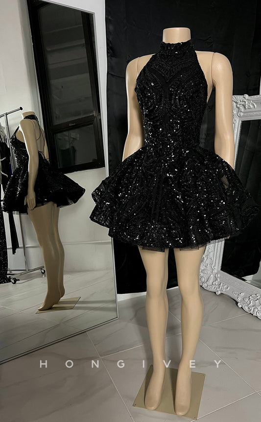 Halter Sequined Crisscross Back Glitter Sleeveless Sheath Mini Homecoming Dresses
