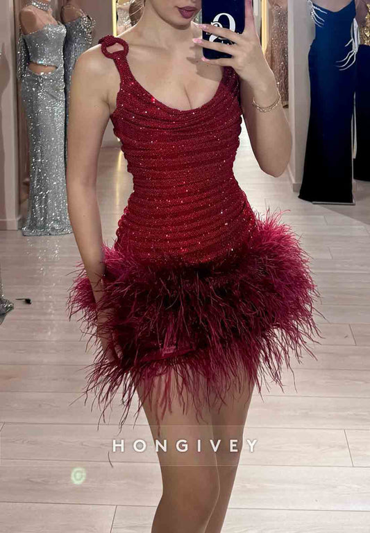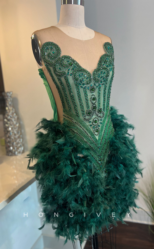 H2093 - Sexy Fitted Glitter Illusion Scoop Sleeveless Sequined Feathers Homecoming Dresses For Black Women