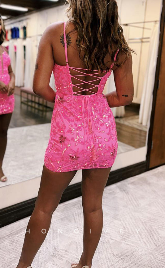 H2112 - Sexy Fitted Glitter V-Neck Spaghetti Straps Appliques Short Party/Homecoming Dress