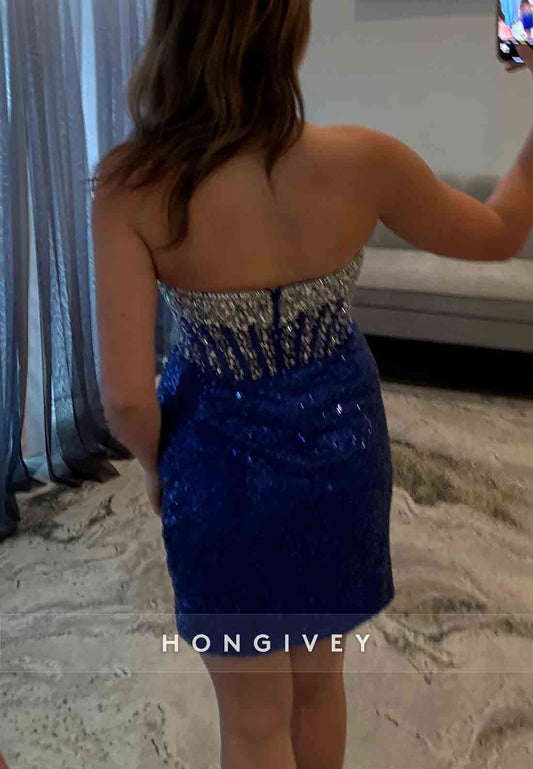 Sheath Side Slit Strapless Low Back Pleated Rhinestone Mini Homecoming Dresses