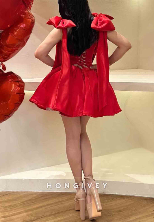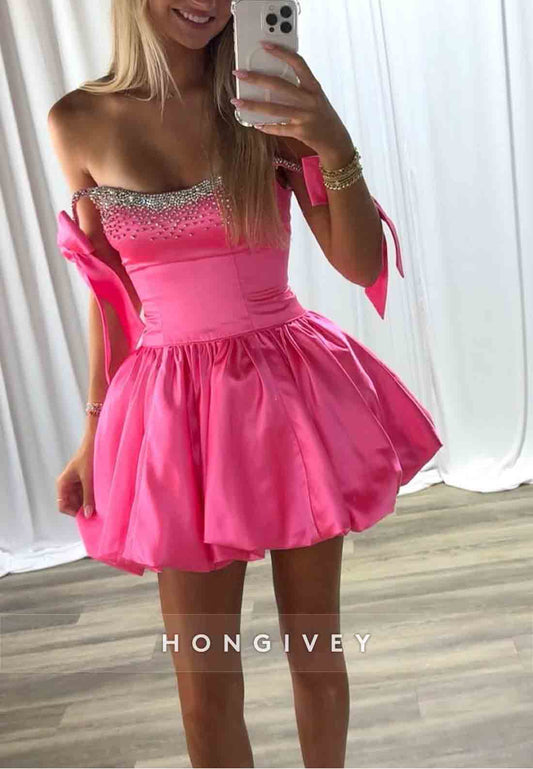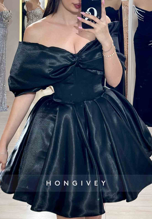 Bowknot Beading Off the Shoulder Satin Pleated Princess Mini Homecoming dresses