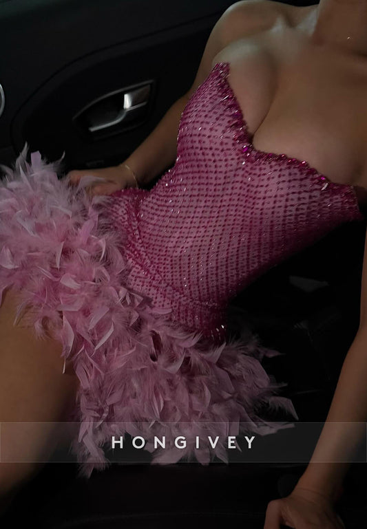Low V-Neck Strapless Feather Sheath Sleeveless Glitter Mini Homecoming Dresses