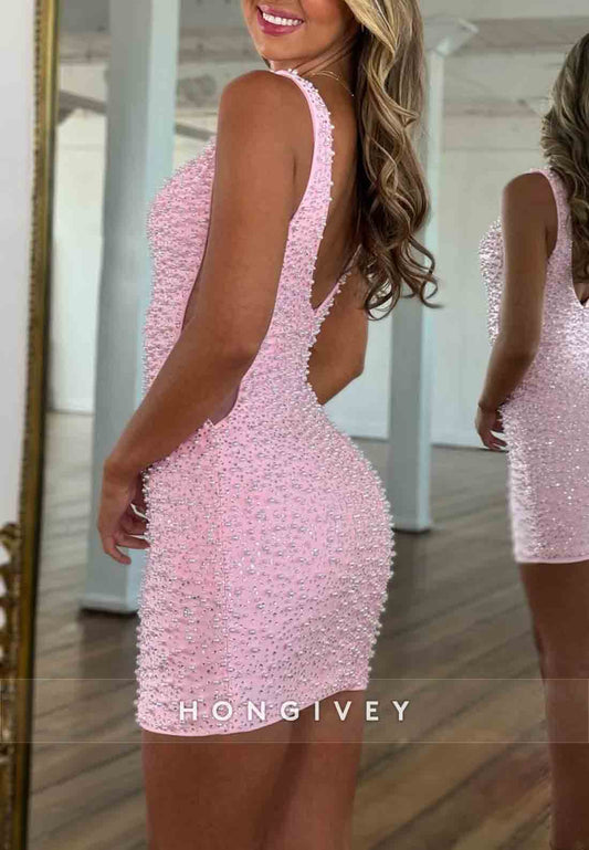 Sexy Sleeveless Low V-Neck Tie Back Beading Sheath Mini Homecoming Dresses