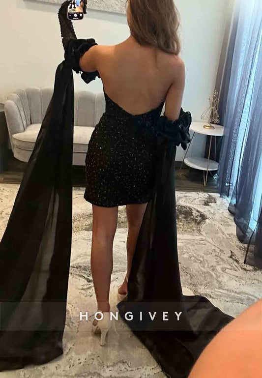 Glitter Pleated Sheath Strapless Mini Half Sleeves Backless Homecoming Dresses
