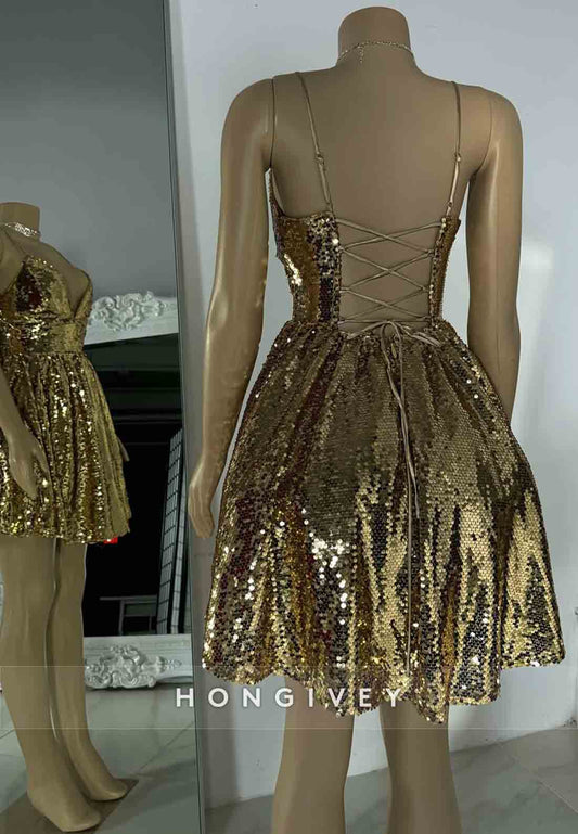 Low V-Neck Spaghetti Straps Sequined A-Line Short Pleated Homecoming Dresses