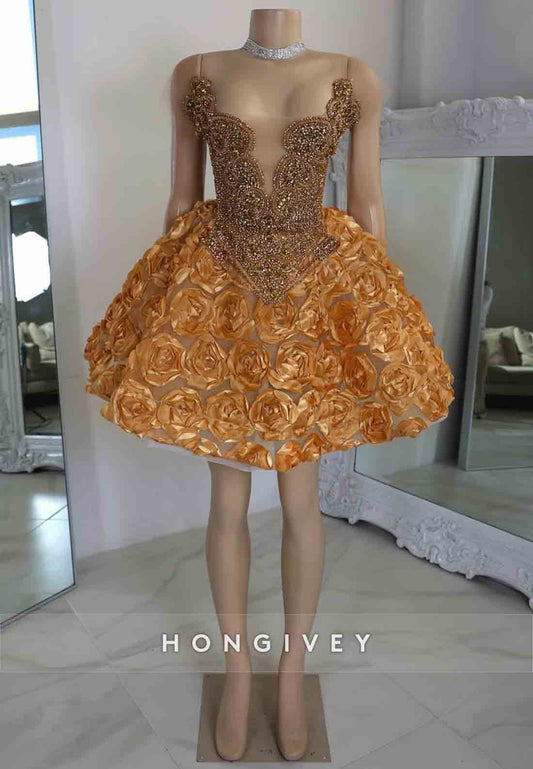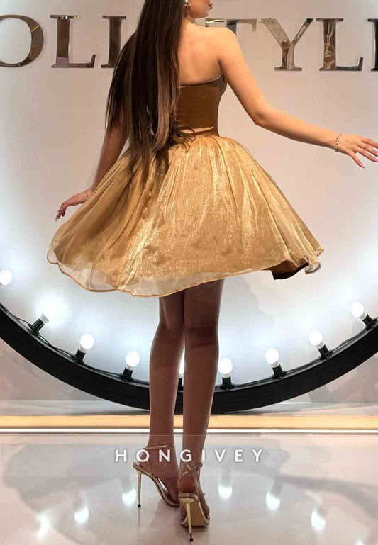 Golden Flowers Strapless Short Pleated Sleeveless Princess Homecoming Dresses