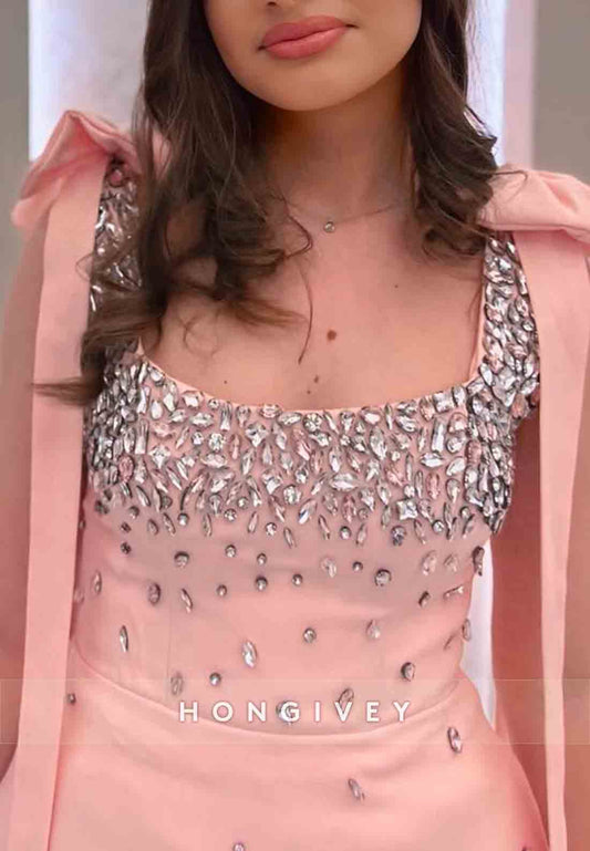 Blushing Pink Rhinestone A-Line Bowknot Square Neck Sleeveless Mini Homecoming Dresses