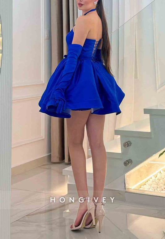Halter Ball Gown Royal Blue Crisscross Back Short Homecoming Dresses