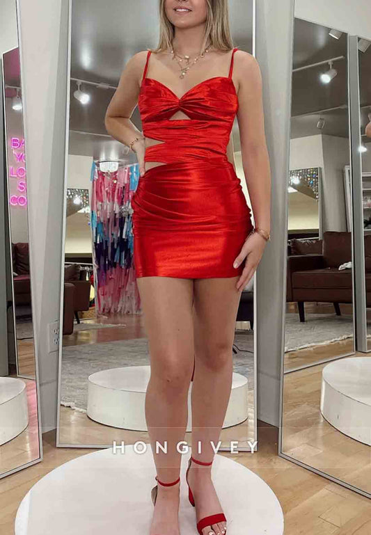 Red Sleeveless Regular Straps Elastic Satin Pleated Mini Homecoming Dresses