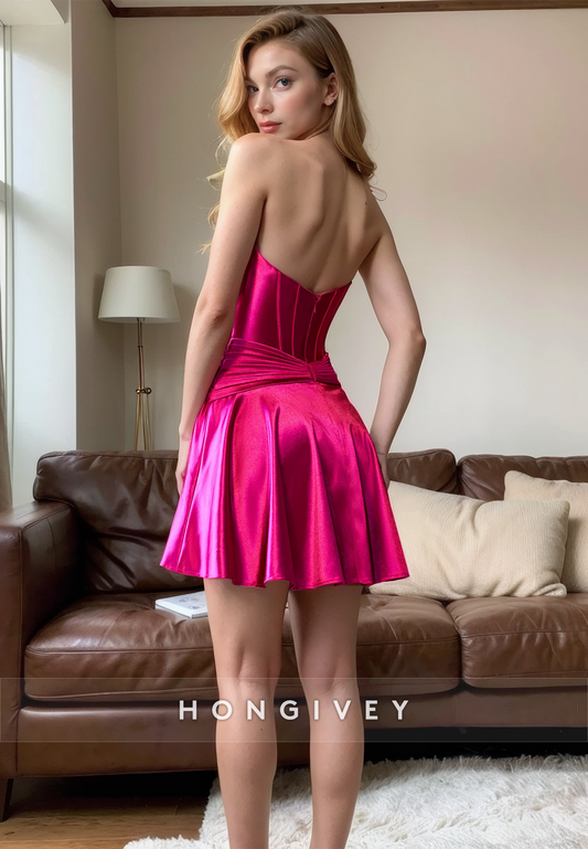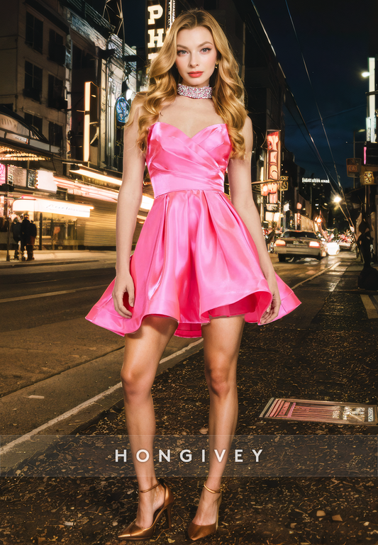 satin a-line V-Neck Strapless Ruched Short Homecoming Dress