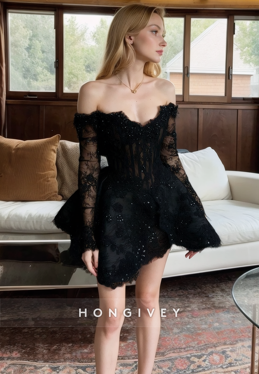 Chic A-Line Off-Shoulder Long Sleeve Lace Applique Short Homecoming Dress