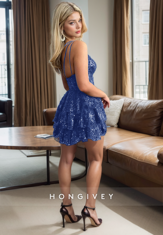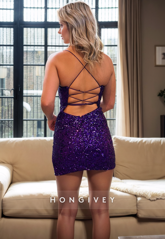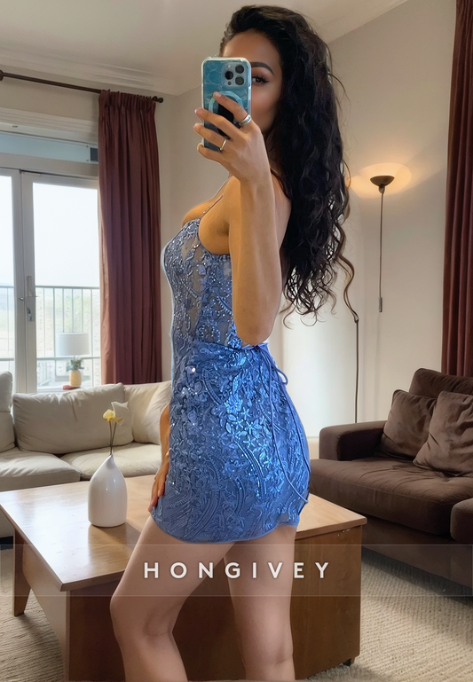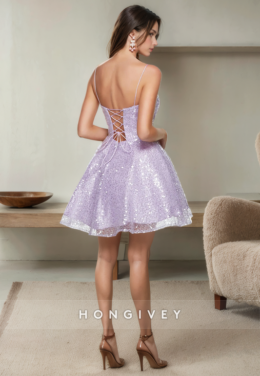 Chic Fitted Sparkly V-Neck Spaghetti Straps Lace-Up Short Party Homecoming Dress