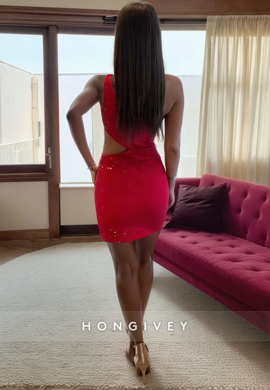 Sparkly Sheath One Shoulder Empire Sequined Evening Homecoming Dress