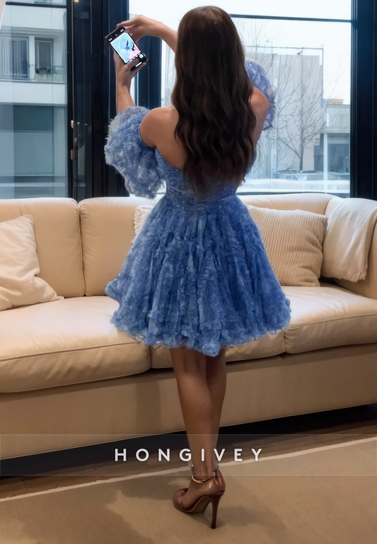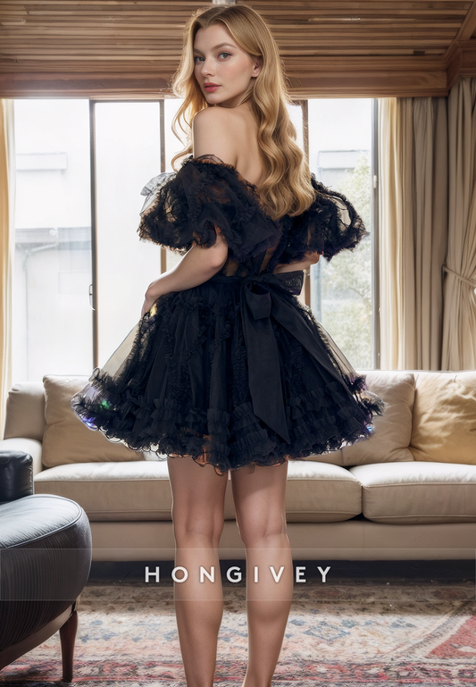 Tulle A-Line Off-Shoulder Puff Sleeves Appliques Short Party Evening Homecoming Dress