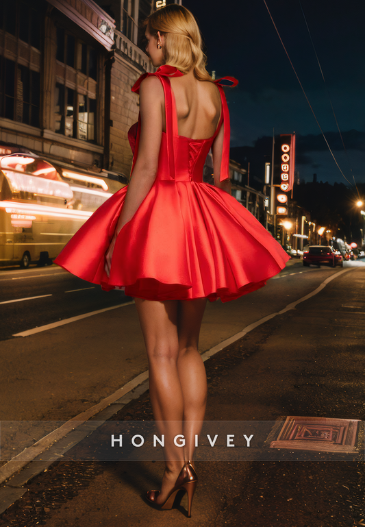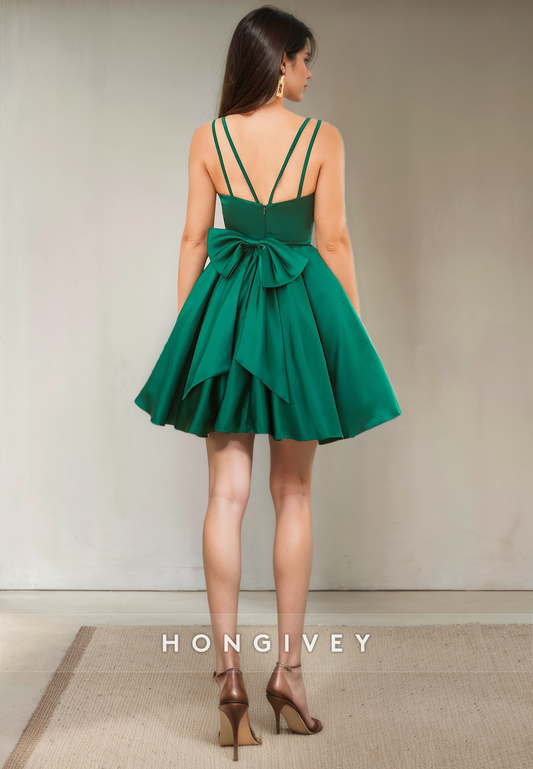 Satin A-Line V-Neck Spaghetti Straps Bowknot Short Party Homecoming Dress