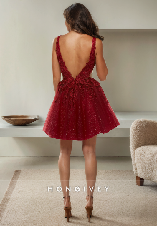 Tulle A-Line V-Neck Sleeveless Appliques Short Party Homecoming Dress