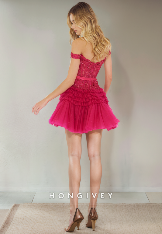 Glitter Tulle A-Line Square Off-Shoulder Tiered Short Homecoming Dress