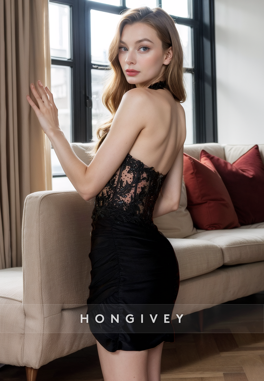 V-Neck Halter Lace Applique Fitted Short Homecoming Dress