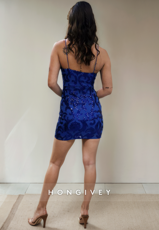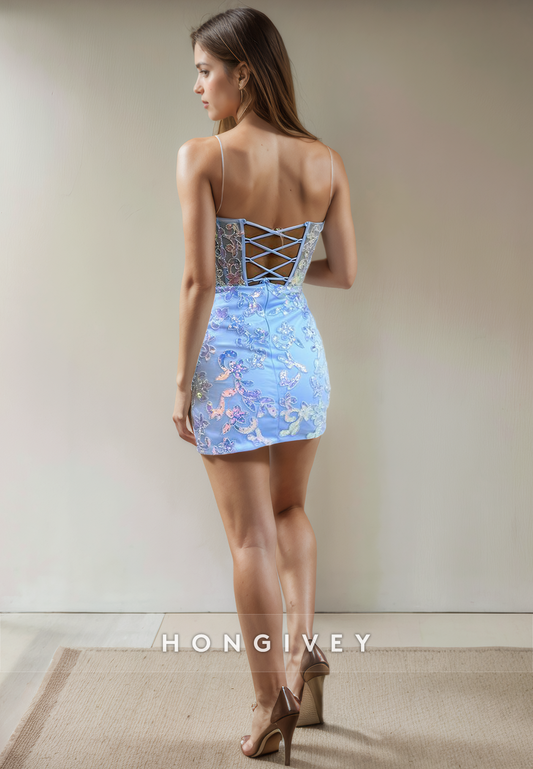 Fitted Sheer Sweetheart Spaghetti Straps Sequined Appliques Short Party Homecoming Dress