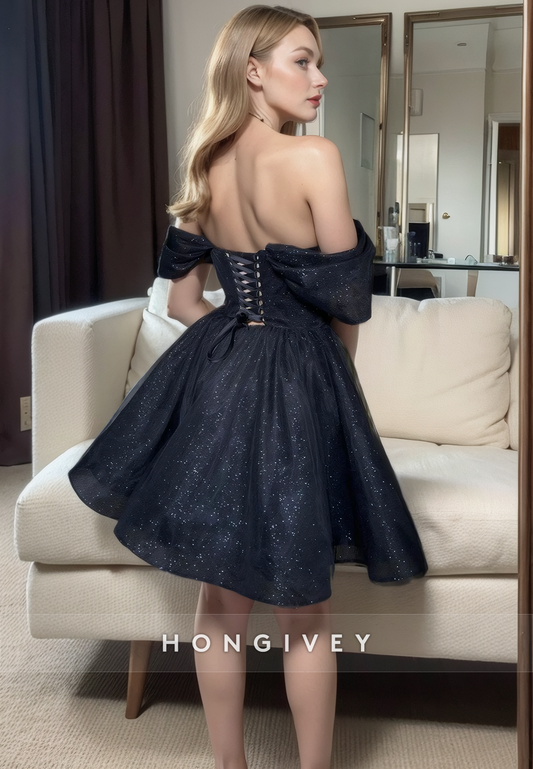 Glitter Tulle A-Line Off-Shoulder Beaded Sequined Short Homecoming Dress