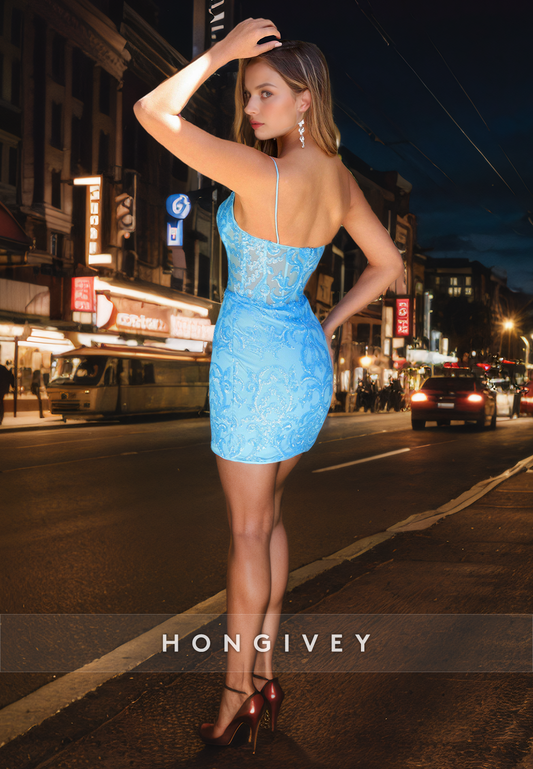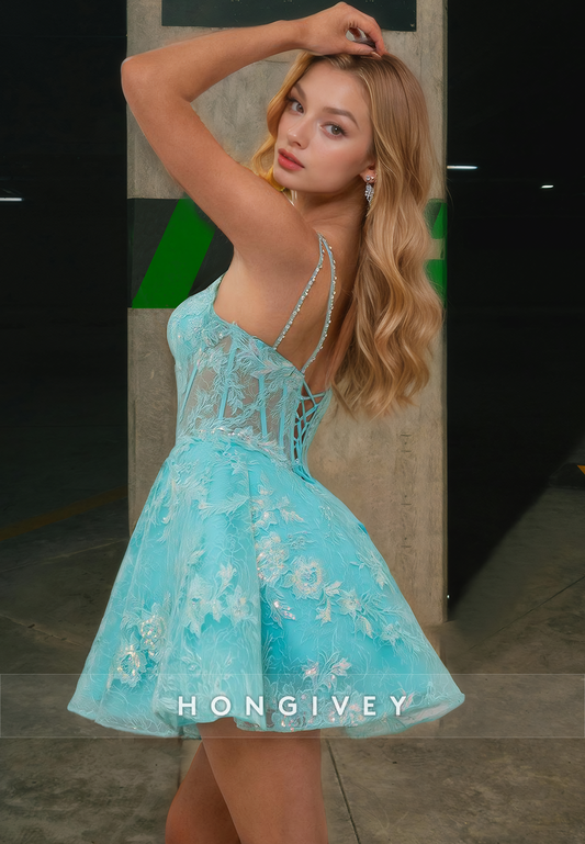 Fitted V-Neck Spaghetti Straps Sheer Appliques Short Homecoming Dress