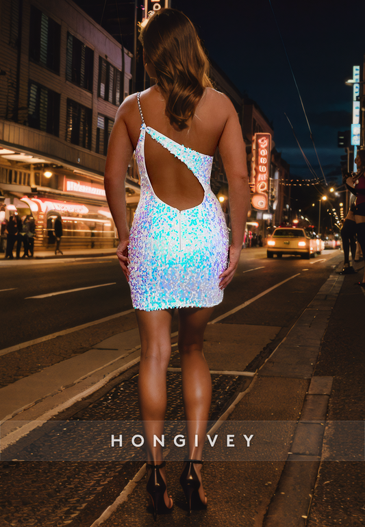 Sexy Fitted One Shoulder Fully Sequined Short Homecoming Dress