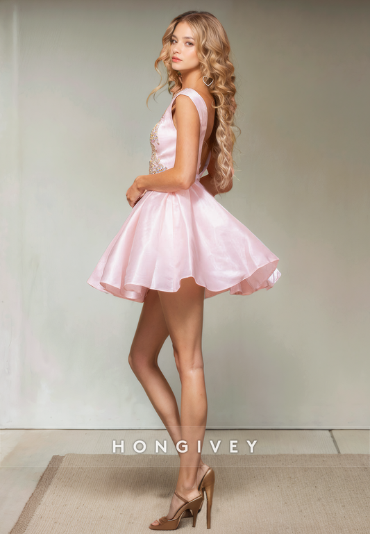 Chic Satin A-Line V-Neck Appliques Short Party Homecoming Dress