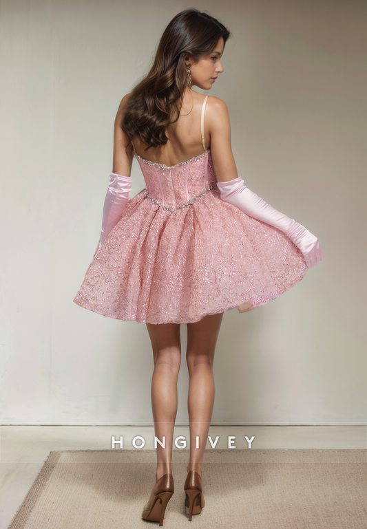Lace A-Line Sweetheart Spaghetti Straps Sequined Appliques Short Party Homecoming Dress