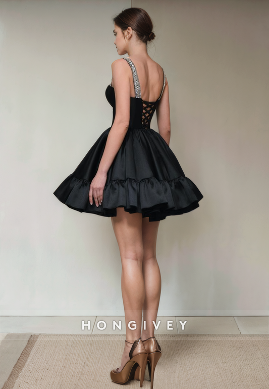 Casual Satin A-Line Square Spaghetti Straps Short Party Homecoming Dress
