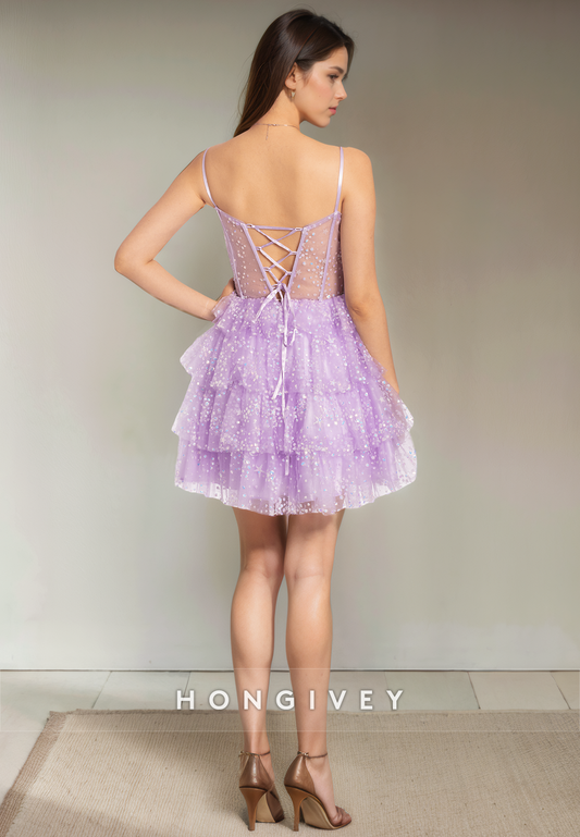 Glitter Fitted V-Neck Spaghetti Straps Lace-Up Short Party Homecoming Dress