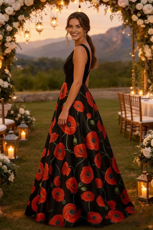 V-Neck Sleeveless Flowers Floral Print A-Line Women Evening Dress