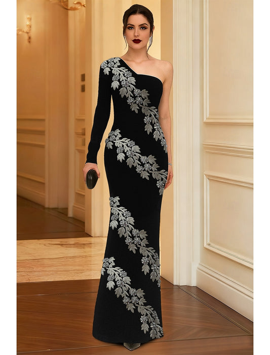 One Shoulder Long Sleeve Applique Mermaid Evening Dress