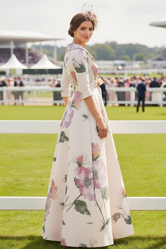 V-Neck 3/4 Sleeve A-Line Flowers Floral Print Formal Evening Dress
