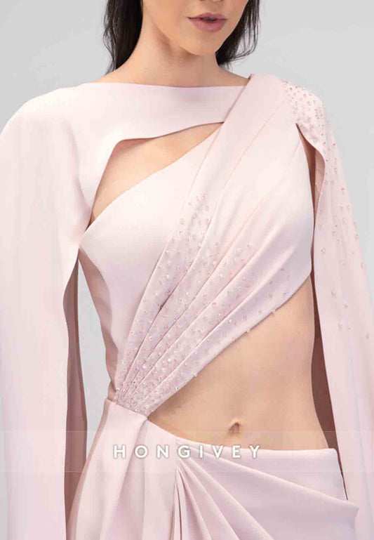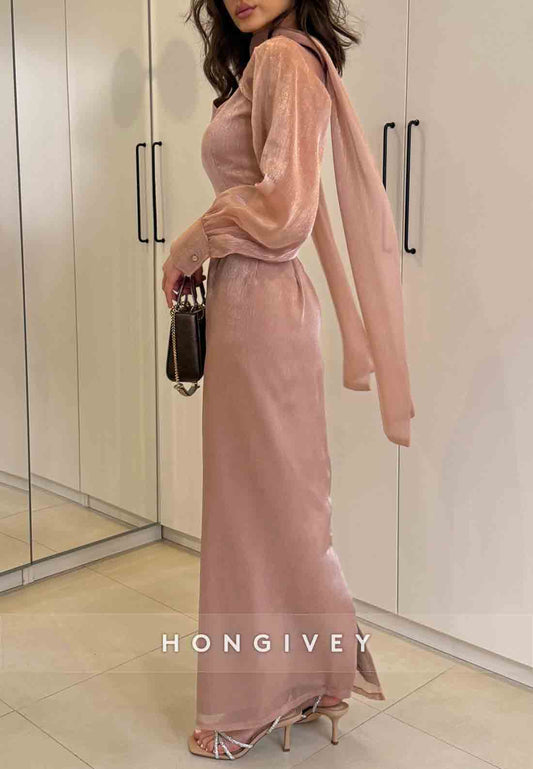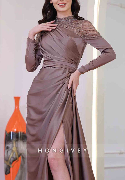 Side Draping High Slit Sheath High Neck Long Sleeve Pleated Beading Evening Gown
