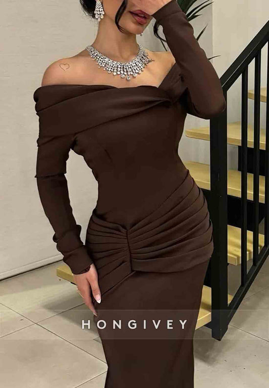 Off the Shoulder Long Sleeves Floor-Length Sheath Pleated Evening Gowns