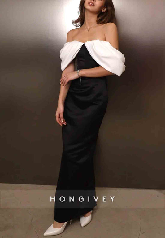 Low Back Off the Shoulder Satin Floor-Length Sheath Pleated Evening Gown