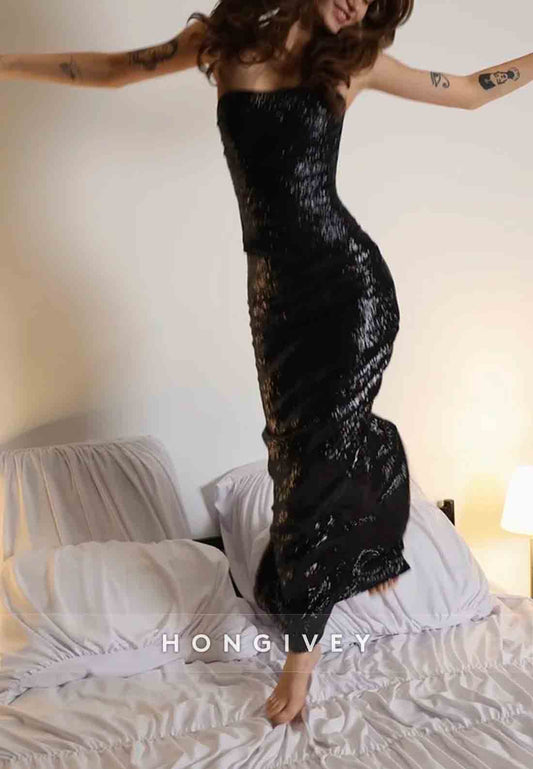 Strapless Simple Floor-Length Sleeveless Column Sequined Evening Gown
