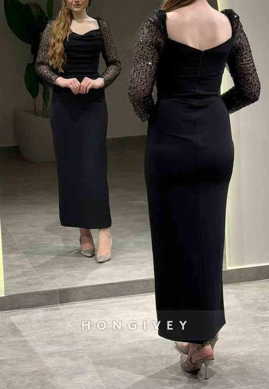 Square Long Sleeves Formal Gowns Ankle-Length Black Appliqued Column Evening Gowns