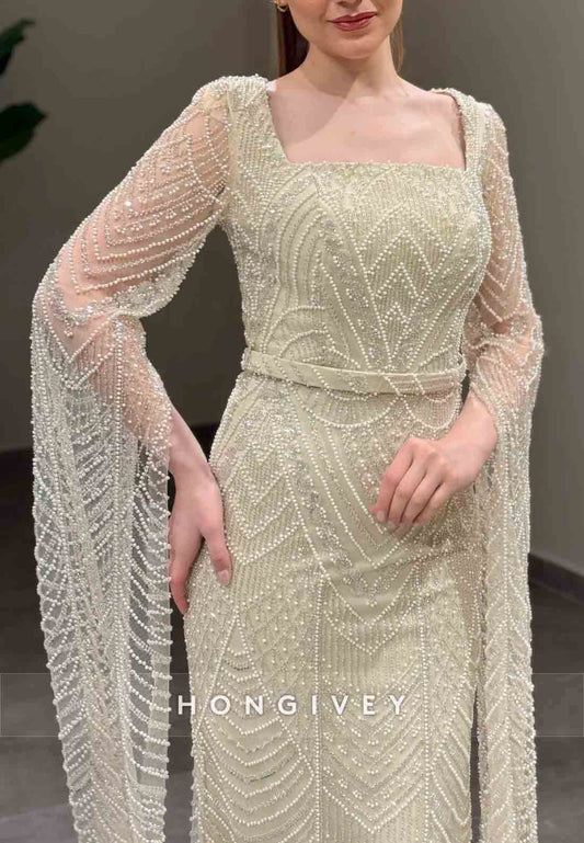 Square 3/4 Sleeve Pleated Floor-Length Trumpet Beading Evening Gowns