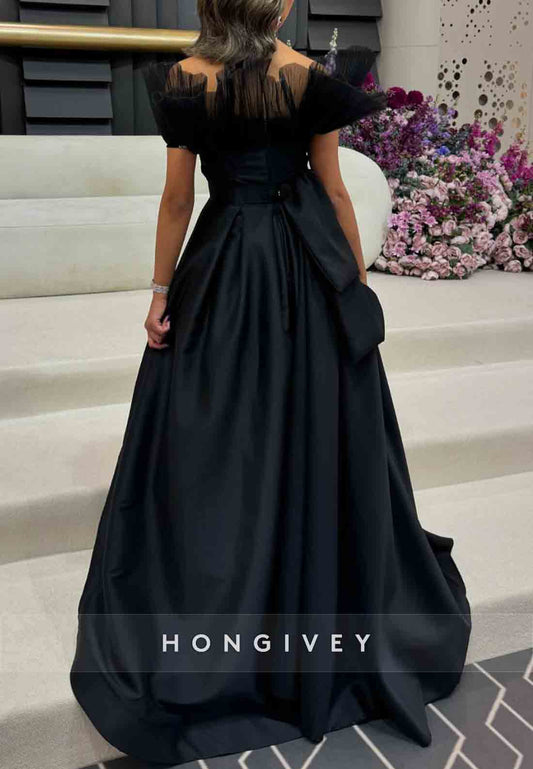 High Slit Satin Off the Shoulder Floor-Length A-Line Pleated Evening Gowns